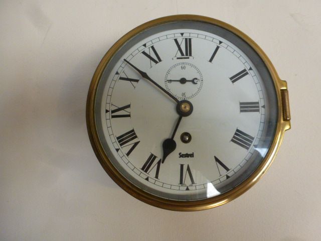 This is a brass cased ships clock by Sestrel with painted 5.5 inch dial and subsidiary seconds and is an 8 day movement