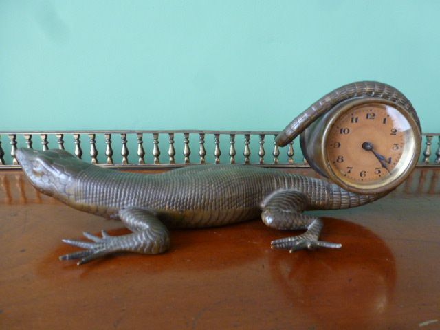 This is a superb cast bronze novelty mantel clock in the form of a lizard with a 30 hour clock movement held in it’s tail, stands 9.5 cm tall and is 26 cm wide