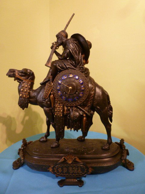 A very rare French striking mantel clock in its period display case. The case is spelter then bronzed and gilded with many decorative pieces that goes which the Arab and his Camel in wonderful original condition. The dial has enameled numerals and gilded moon hands. The movement strikes the hours and then once at half past on its bell. After servicing this clock it was found that the clock ran unassisted for about 20 days. The clock itself stands 20 3/4″ high and 17″ wide. Circa 1880.