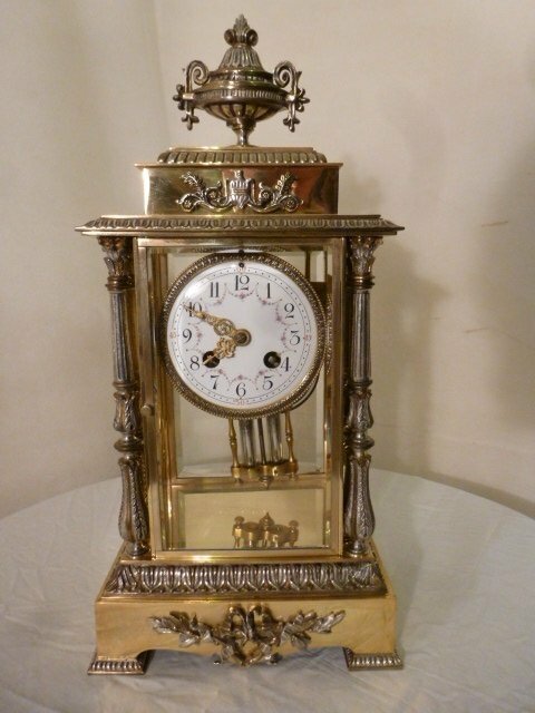 A fine French 8 day striking Four glass mantel clock. The case with gilded & silvered decoration of fine detail having four thick beveled edged glasses. An enameled garland dial with Arabic numerals. Strikes the hours and half hour on a coiled gong. 16 1/2″ tall, C1870.