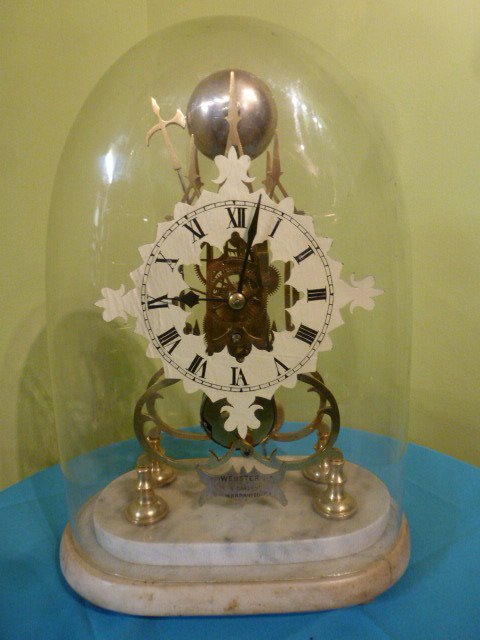A Victorian single fusee skeleton clock with passing strike sitting on it’s original marble base and under it’s original glass dome. Thick cast brass plates with 4 spoke wheelwork to a fusee 8 day duration movement with passing strike, so strikes just once on every/any hour on a cast bronze bell. This clock has the makers name or retailers name of “Webster” on a silvered plaque below. stands in all 17″ tall. Circa 1880.